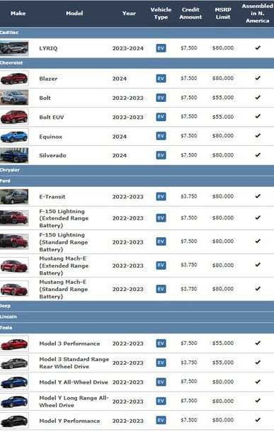 IRA는 북미에서 조립된 전기차에 대해서만 세액공제 형태로 보조금을 지급하도록 규정하고 있습니다. 올해부터는 북미에서 제조·조립한 배터리 부품을 50% 이상 사용하고, 미국이나 FTA 국가에서 채굴·가공한 핵심광물의 40% 이상 사용해야 보조금이 지급됩니다. 결과적으로, 이번 목록에는 미국 제조사의 차량만 포함되어 있습니다.